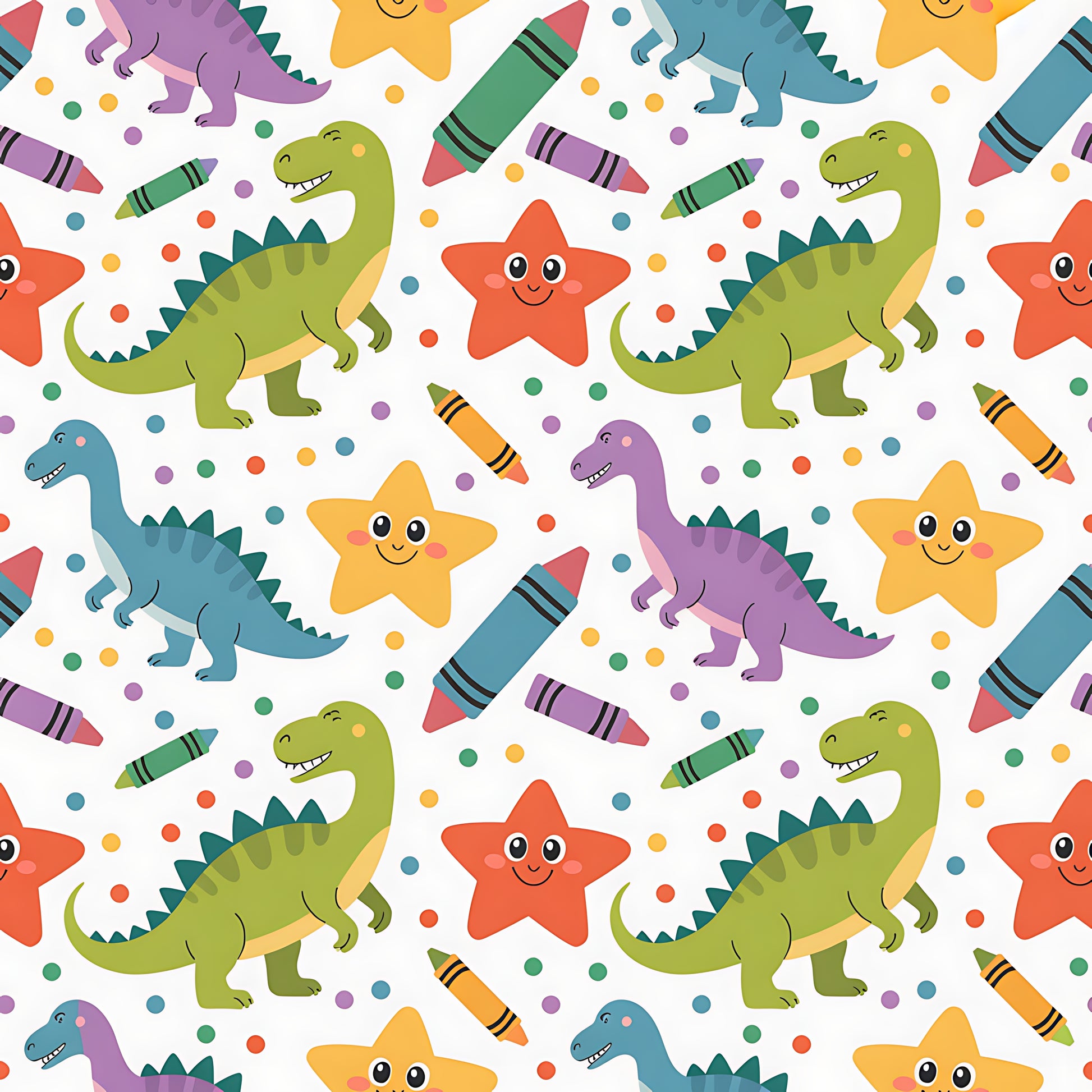 Crayon Dino Fun is a bright, playful seamless pattern packed with colourful dinosaurs, smiling stars, crayons, and confetti dots. Ideal for boys’ rooms, school labels, backpacks, laser-cut signs, and kids’ product lines.
