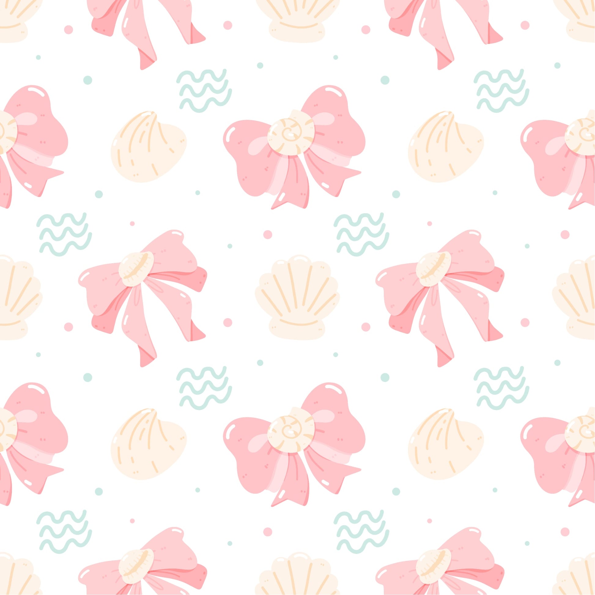 This seamless pattern features soft pink bows adorned with seashell centres, scattered shells and whimsical wave accents. The mix of pastel tones and ocean-inspired details creates a design that’s sweet yet sophisticated — perfect for statement signage, trendy prints, gift items or modern feminine branding with a seaside vibe