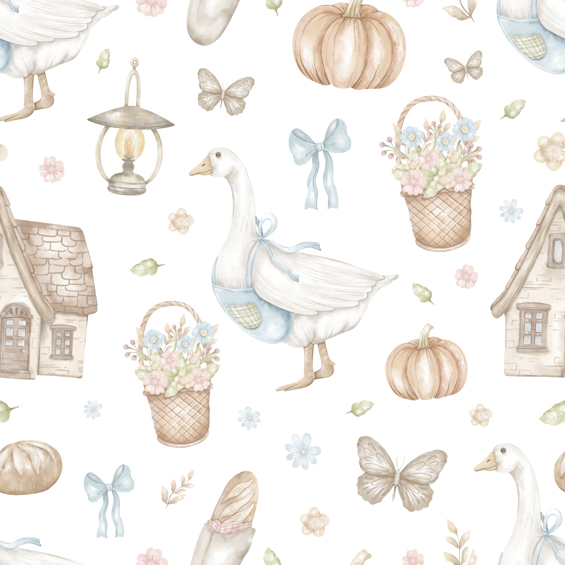 A beautifully detailed watercolour pattern showcasing graceful geese alongside soft florals, pumpkins, baskets and quaint cottage elements. With its muted pastel palette and gentle storybook feel, this design captures rustic warmth and countryside elegance.